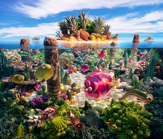 Primero se monta y se fotografía el primer plano, luego el fondo y, por último, el cielo. El resto son horas de retoque fotográfico y el resultado, desde mi punto de vista, una maravilla. Se ha utilizado para una campaña publicitaria de una cadena de supermercados británicas, pero el autor reconoce que sus imágenes son una herramienta útil para animar a los niños a ver la comida de una manera más lúdica y, por lo tanto, motivarles a una alimentación más saludable.