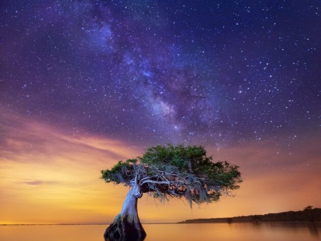 El modelo fue un ciprés de los pantanos (Taxodium distichum) solitario que crece en un lago, a cierta distancia de la costa de Florida. Salvado de la tala por tratarse de un ejemplar pequeño y atrofiado, con los años ha desarrollado una forma sorprendente. A la imagen del espectacular ciprés, quiso unir la belleza de la visión nocturna de la Vía Láctea y, por suerte para él, esa noche la luz de la luna estaba ausente… Disparó la cámara con un control remoto inalámbrico. El resto es historia, mejor dicho, es una foto que ha logrado el tercer puesto en el concurso de fotografía que organiza Kew Gardens, International Garden Photography of the Year (IGPOTY) en la edición N.8 y en la categoría Trees, Woods & Forests.
