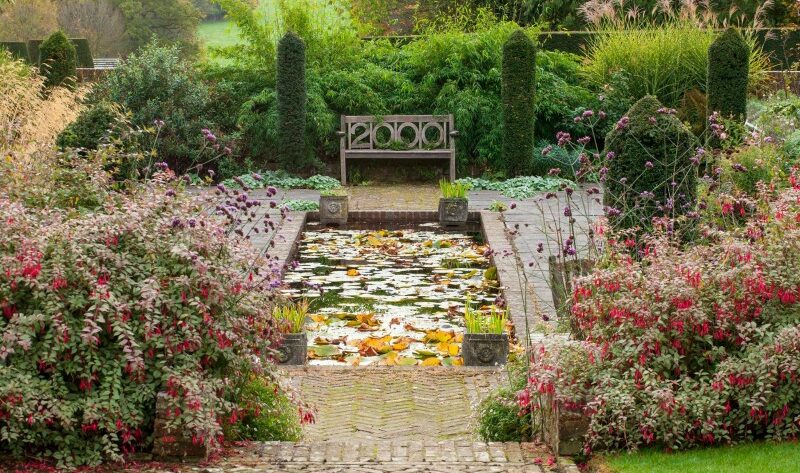 La foto es de Clive Nichols y está hecha en Hole Park Gardens, en Kent, Inglaterra. Un jardín inglés donde se puede apreciar cómo las ligeras flores en tono violeta de la Verbena bonariensis; y el intenso color de las fuchsias, crean una cálida y bellísima paleta de otoño. Como siempre un hermoso jardín al que el arte de la fotografía ha mimado para hacerle justicia.