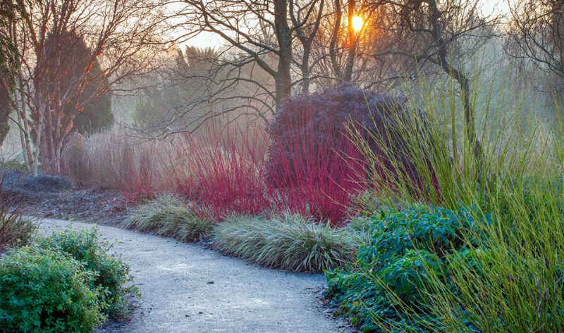 El color rojo brillante de los tallos del Cornus alba ‘Sibirica’ en invierno son protagonistas indiscutibles de esta foto, realizada por Clive Nichols en los jardines denominados Sir Harold Hillier Gardens, en Hampshire, condado no metropolitano que se sitúa en la costa sur de Inglaterra, Reino Unido.
