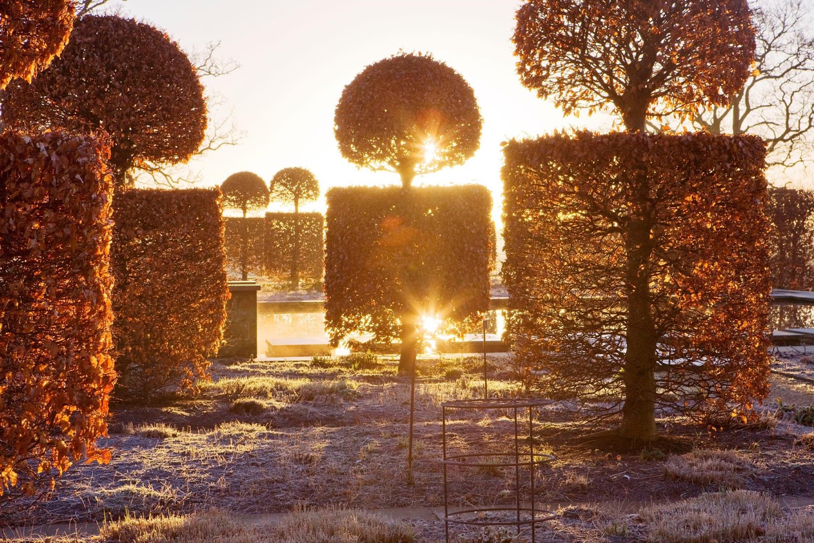 Esa división, que puede disfrutarse especialmente durante el invierno, la forman dos túneles de gran tamaño de haya recortada. Son elementos de topiaria que ofrecen intensas tonalidades verdes durante la estación estival, y en invierno, tiñen el jardín de un tono dorado oxidado que recuerda al acero corten, dejando pasar -como se aprecia en esta fotografía de Clive Nichols– el sol invernal a través de sus ramas medio desnudas. Una maravilla…