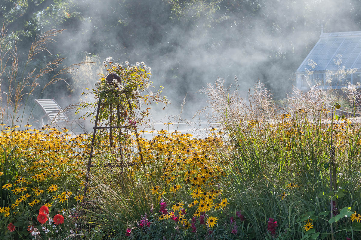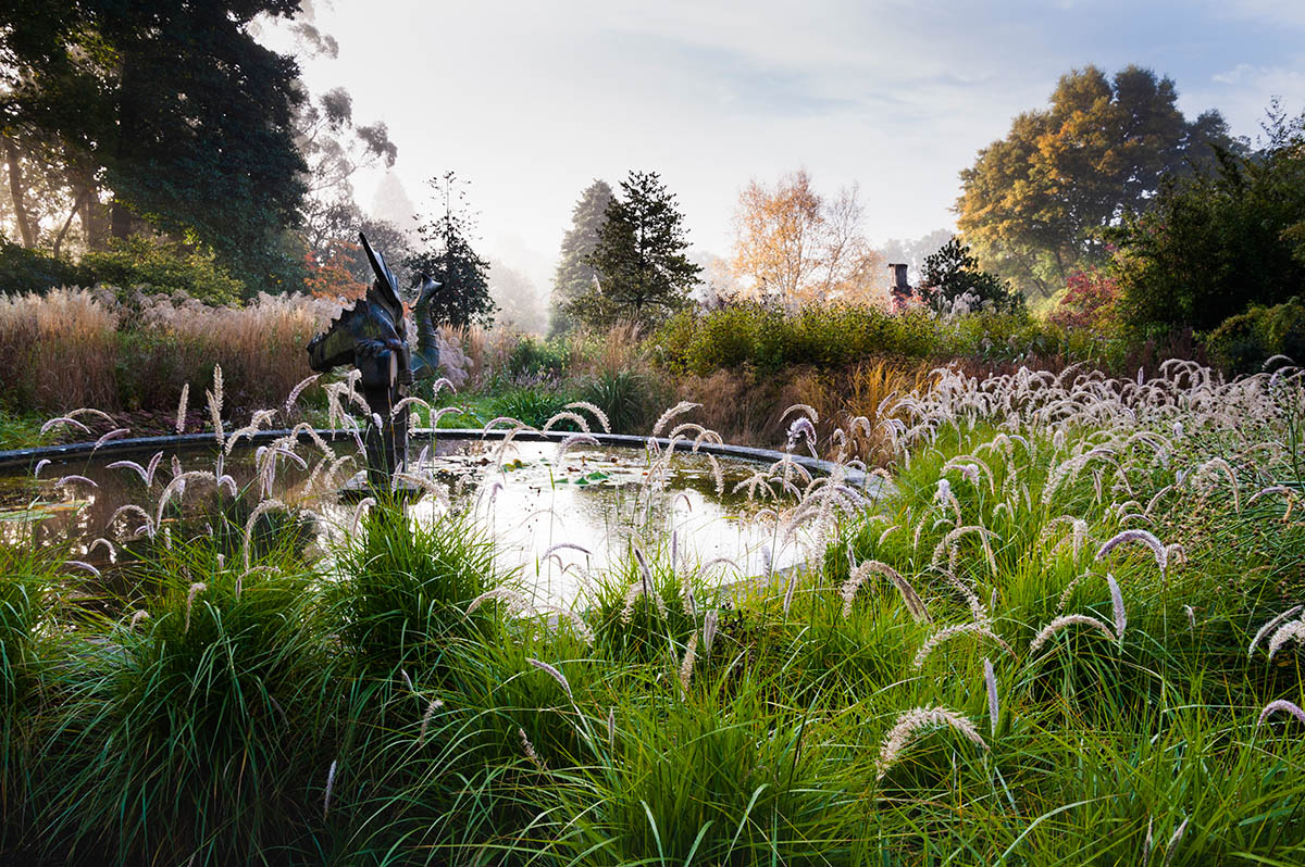 Precisamente en Knoll Gardens también se ha realizado la fotografía Fairy Tails, realizada por Carole Drake, fotógrafa y escritora de jardines británica, con un interés especial en plantas de follaje, jardines verdes y coníferas. En este caso, la fotografía fue tomada en una mañana brumosa de finales de octubre en el Jardín del Dragon, entre las plumas rosadas y esponjosas de Pennisetum ‘Fairy Tails’. El efecto de esta fotografía se logró gracias a que ella (y su trípode) se situaron acurrucados entre las gramíneas para tener una sensación de inmersión. Lo cierto es que, como ella misma reconoce, los jardines creados por Neil Lucas en su vivero son un sueño para cualquier fotógrafo de jardines, especialmente en otoño.
