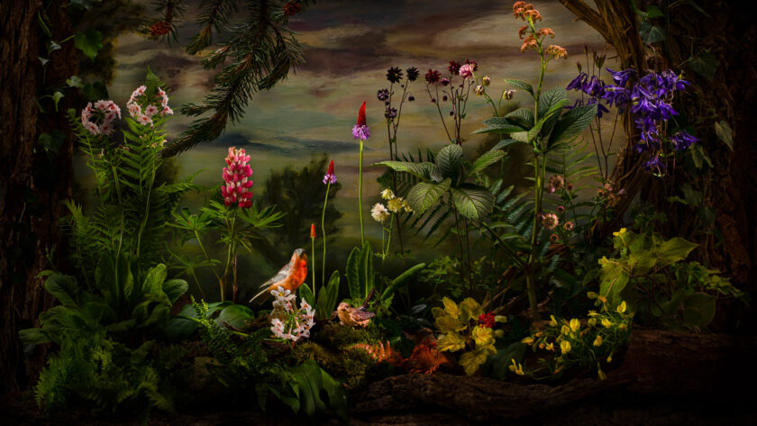 Otra fotografía de Wanjura, que en este caso ha resultado finalista, representa una escena imaginaria de un bosque. El resultado es una evocadora imagen, donde se aprecian ramas y trozos de corteza de plantas locales en primer plano, y en el fondo uno de sus cuadros de paisajes cierra la composición. Dos figuras de porcelana situadas en el centro de la escena emulan dos pájaros en el bosque, dando color y vida a ese arreglo, donde la luz dirige nuestra mirada a cada uno de los elementos que la autora quiere convertir en protagonistas de la imagen.