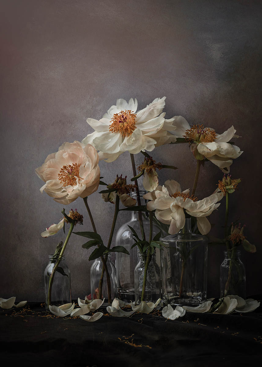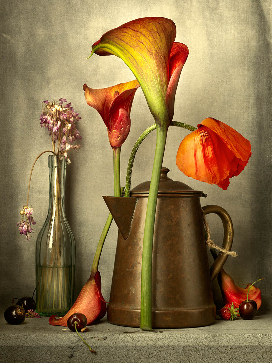 Hay algún que otro bodegón minimalista, como el que se aprecia en la fotografía de Jackie Kramer, una fotógrafa estadounidense que ha querido utilizar la gran botella de perfume como jarrón donde alojar unas calas (Zantedeschia) cuyas cabezas florales se esculpen gracias al uso que hizo de la iluminación (color, dirección, refracción y reflejo). Esa foto obtuvo el tercer premio.