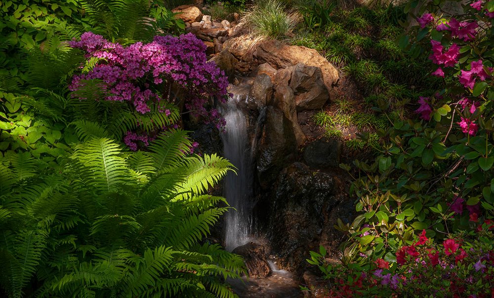 La fotografía de Evgeniya Vlasova, realizada en el Jardín Japonés del Botánico de Praga, nos muestra una cascada en miniatura, rodeada por rododendros en flor y un follaje de helecho verde plumoso, que es iluminada sutilmente por la luz del sol moteada de un día de primavera.