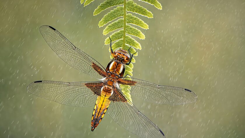 El fotógrafo británico Tony North capturó una libélula de vientre plano (Libellula depressa) hembra sobre una hoja de helecho. Un poco de agua pulverizada sirvió para crear el efecto de lluvia. Esa foto le valió el segundo premio de esta edición.