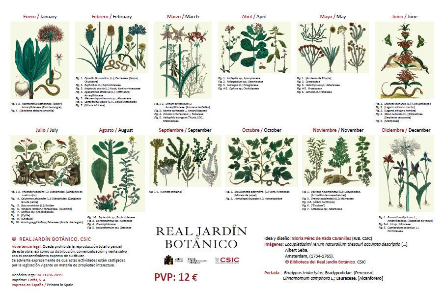 Las ilustraciones de este calendario son parte de esta obra en cuatro tomos encuadernados en piel roja, que fue un regalo del infante Don Antonio Pascual de Borbón (1755-1817), hermano de Carlos IV, a la Biblioteca del Real Jardín Botánico donde se conserva desde entonces. Para los muy “curiosos” esta obra se puede consultar on line en la biblioteca digital del Botánico.