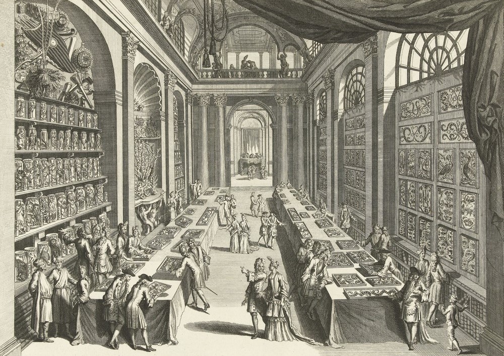 Visitantes en el Gabinete de Curiosidades (Wondertooneel der natuur) de Levinus Vincent en Haarlem, 1706