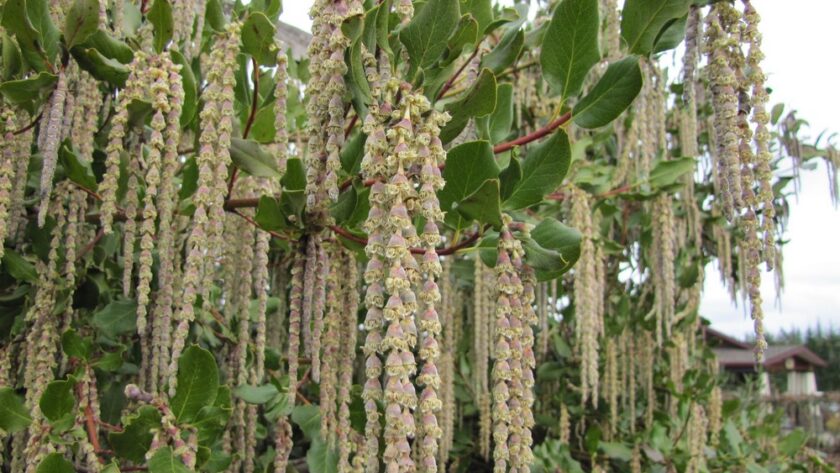 Garrya elliptica ‘Evie’ una forma que alcanza entre 4 y 6 metros de altura y presenta floración masculina seleccionada, con amentos de color blanco cremoso de 8 a 20 centímetros de largo que a menudo adquiere un tono violáceo.