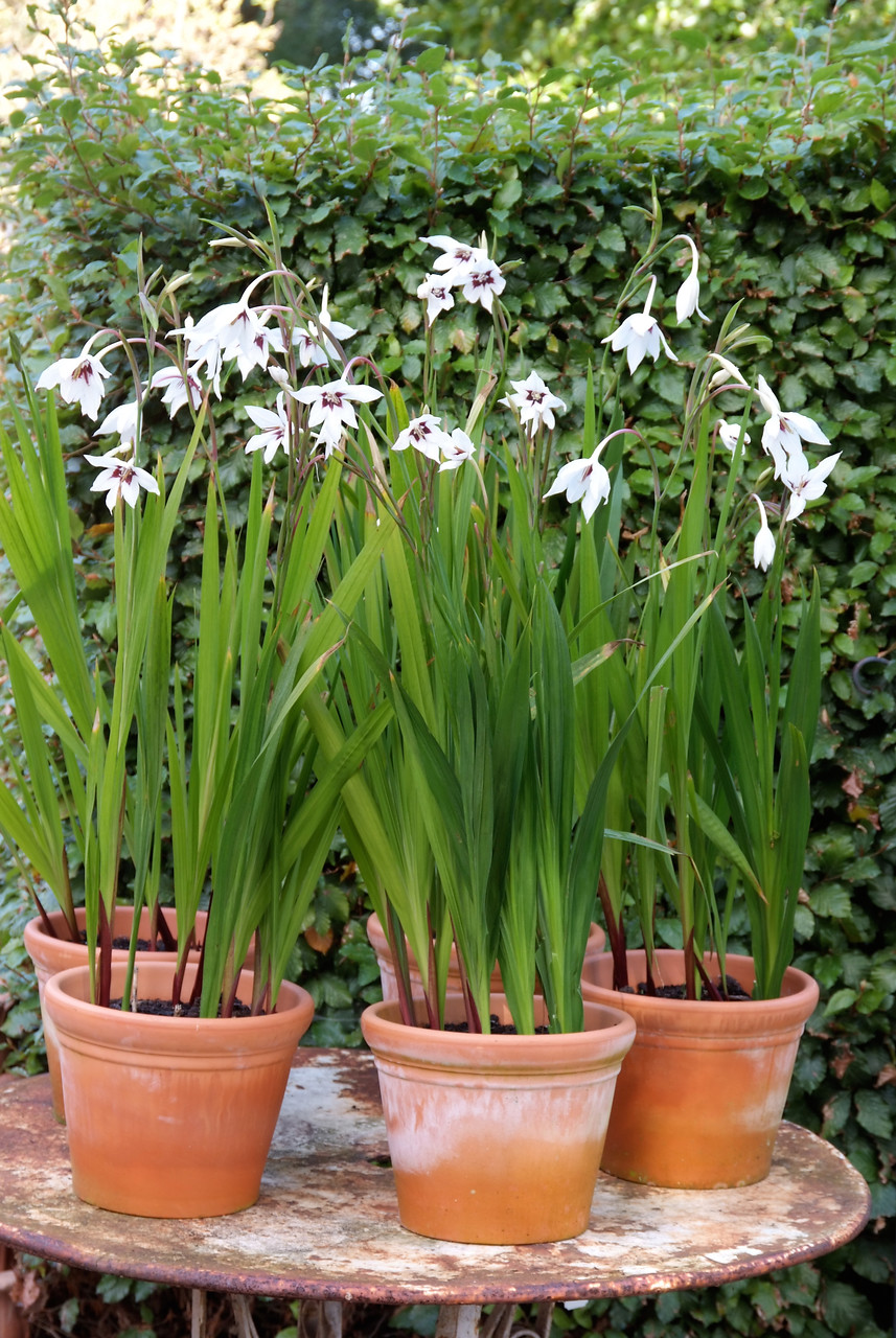 Los gladiolos también son adecuados para su uso en macetas y contenedores. En este caso son especialmente recomendables los híbridos incluidos dentro del grupo de flor pequeña.