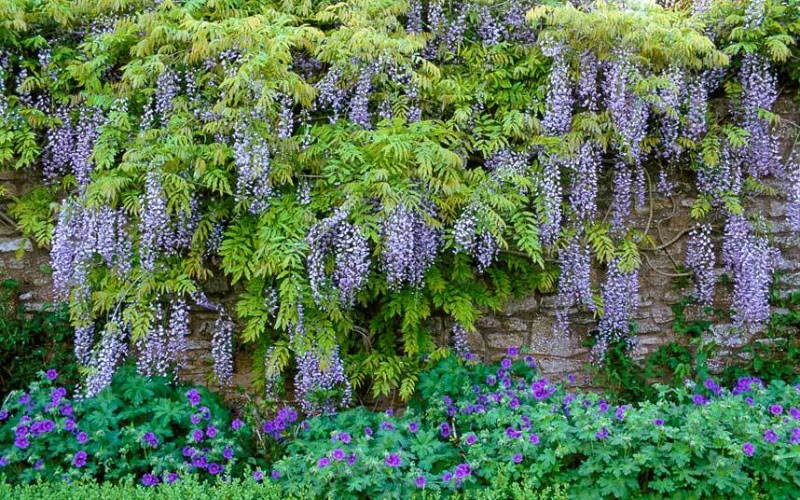 Aquí, Wisteria floribunda aparece combinada con Geraniumx magnificum y la foto está hecha en un jardín que ya hemos «visitado» en este blog: el jardín de Lady Farm en Somerset, Reino Unido. El diseño corresponde a Judy Pearce y la foto es de Jonathan Buckley. ¿Bonita, verdad?.