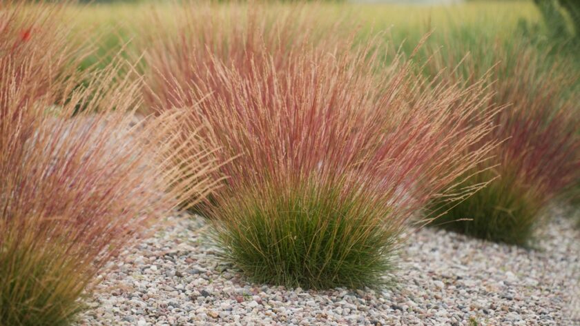 - Muhlenbergia capillaris, gramínea con delicadas nubes de flores rosadas durante el otoño