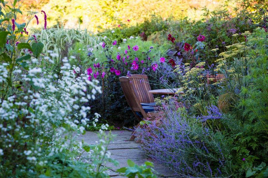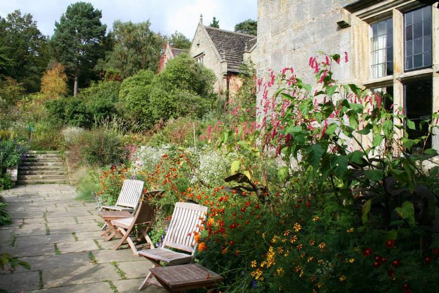 En la parte posterior de la mansión se encuentra la terraza del jardín de flores, un jardín que en vida de Robinson estaba cambiando constantemente mientras jugaba con sus ideas sobre la frontera o bordura mixta.