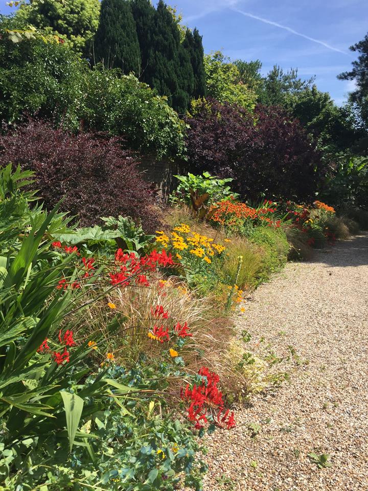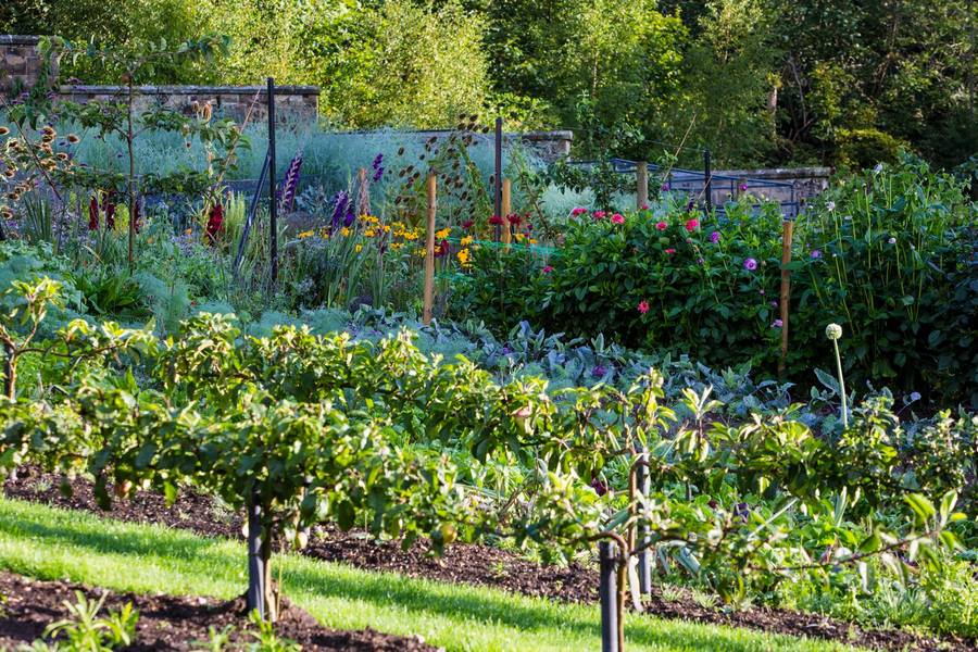 En la cima de la colina, el huerto comenzó con la construcción de los muros de piedra arenisca local de Sussex en 1898, y tardó en construirse tres años. En esos jardines amurallados se cultivaba en su día alimentos para toda la comunidad. Hoy en día, sirven para cultivar productos frescos que utilizan en la cocina del restaurante.