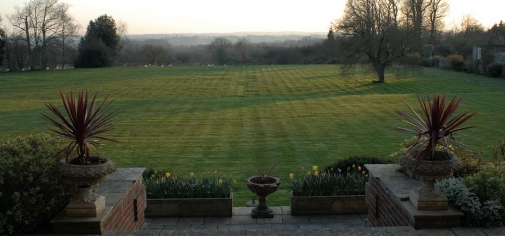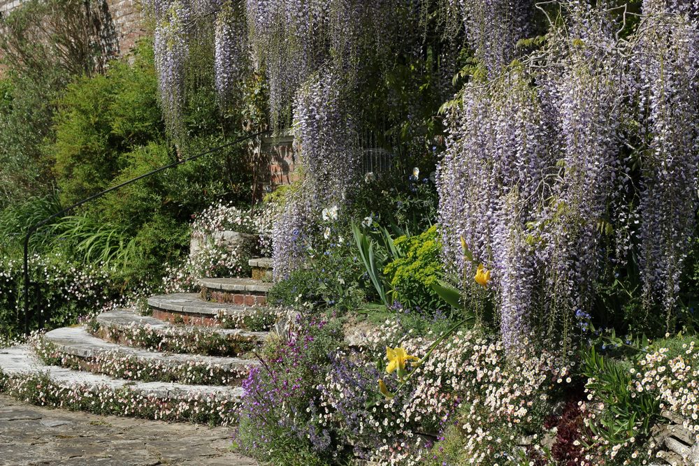Alrededor del césped, el tejo (Taxus baccata) recortado en pilares aporta altura y estructura. Más allá de los muros esperan bosques por explorar, y hacia la entrada principal el suelo se alfombra de campanillas de invierno (Galanthus) que se convierten en heraldos de la primavera, y más tarde llegan los narcisos. Pero la pieza principal de ese jardín es la puerta de hierro negra parcialmente oculta en primavera por una masa de glicinias (foto de portada).