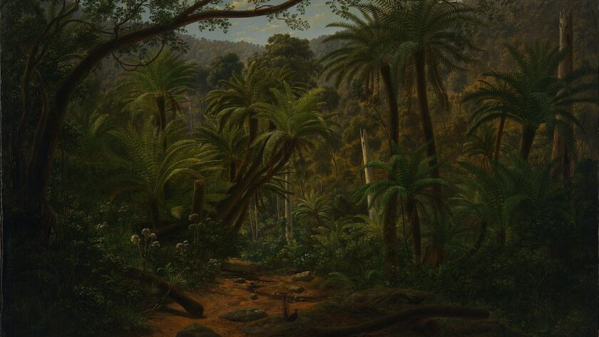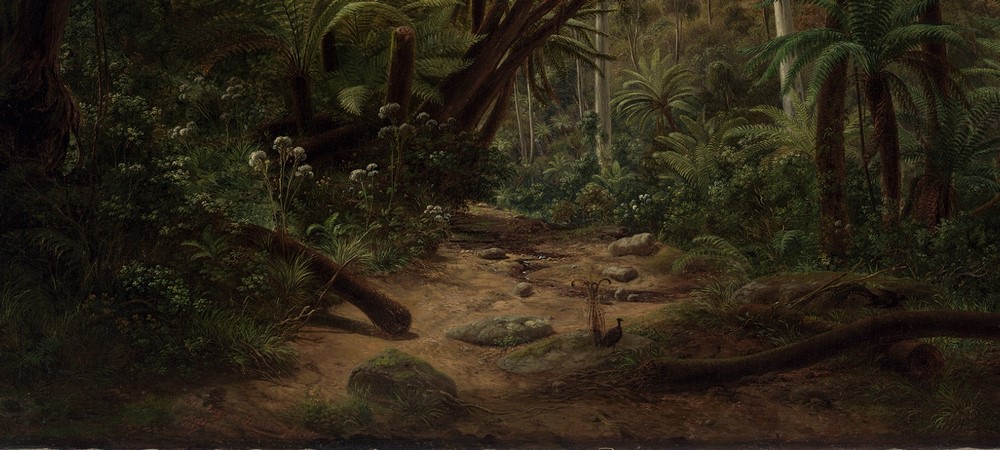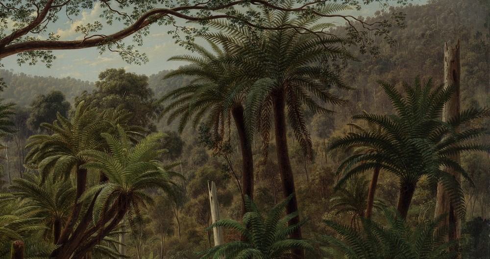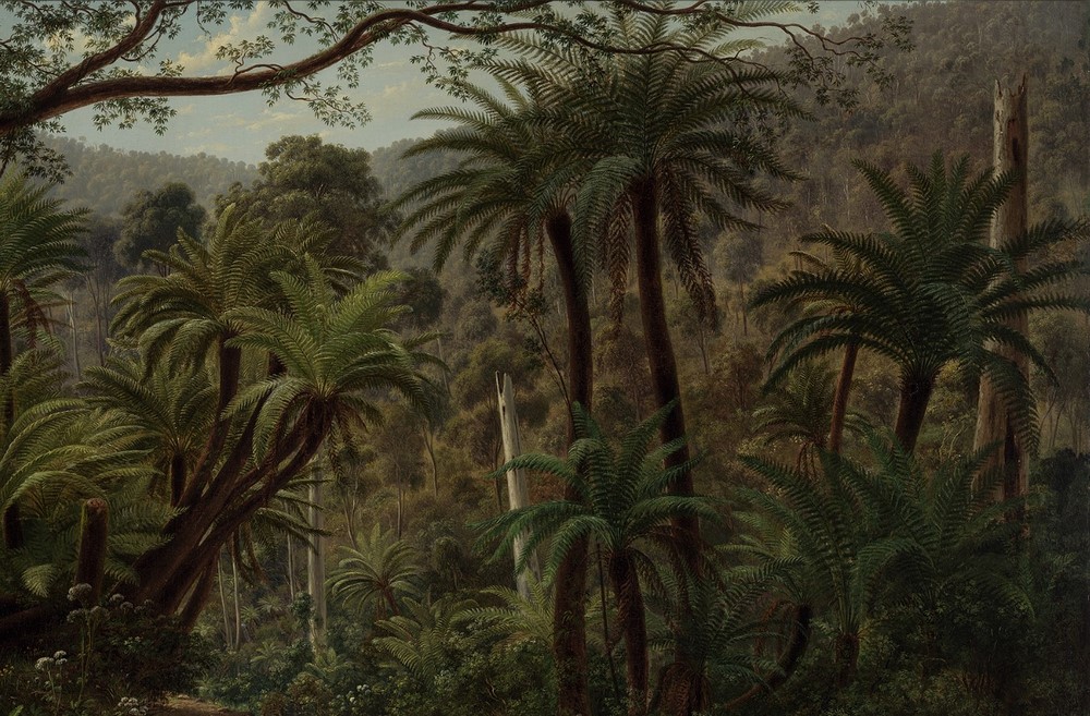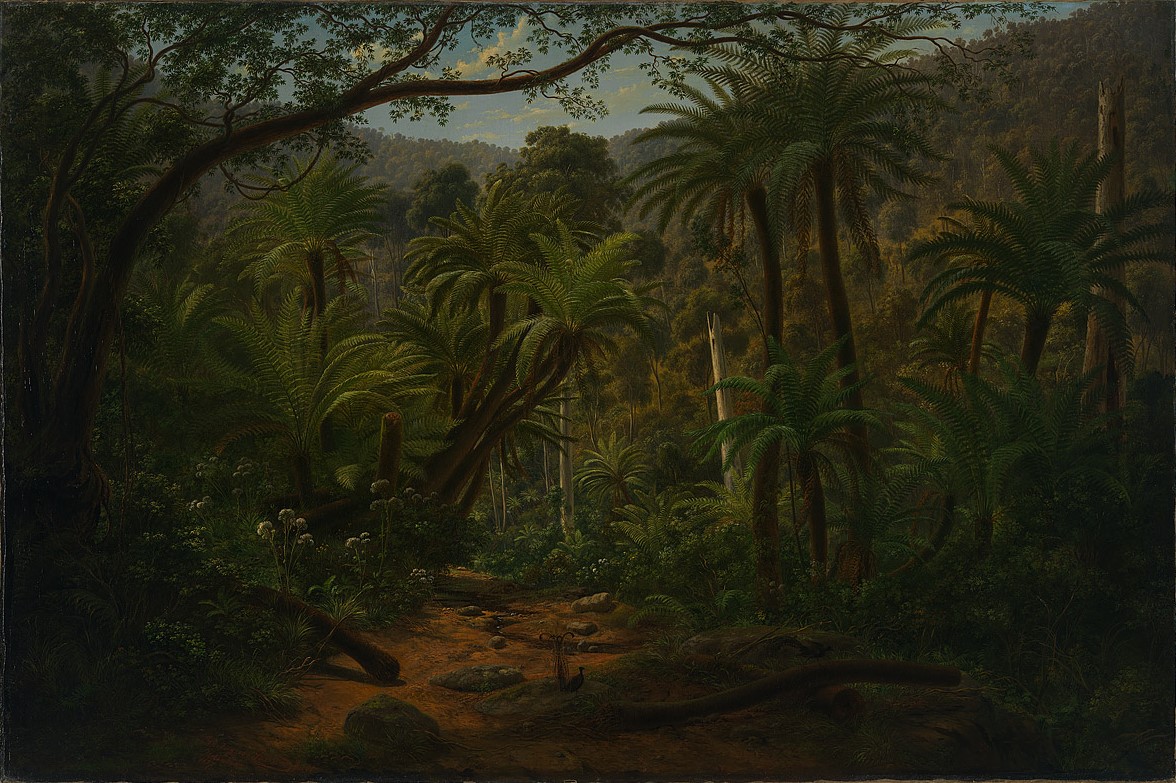 Cuando comenzó a visitar las cordilleras de Dandenong (Dandenong Ranges), habitualmente conocidas como Las Dandenongs, el área era un denso matorral de bosques templados y fríos barrancos de helechos. El cuadro que muestro hoy, datado en 1857, está pintado después de regresar a su estudio de Melbourne y representa una escena en Ferntree Gully, en las estribaciones de Las Dandenongs, a 32 km al este del distrito central de negocios de Melbourne.