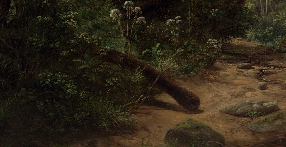 Una pintura imponente, en la que Eugene von Guérard combina el verdor y la frescura de un arroyo arbolado con la elegante exuberancia tropical que ofrecen las coronas de enormes frondes de los helechos arborescentes.