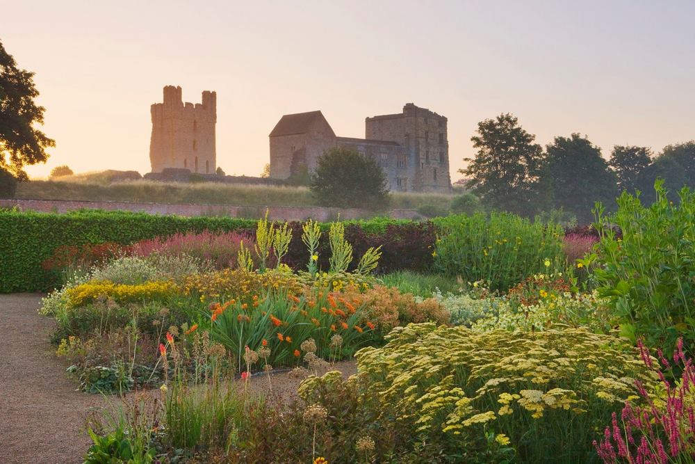 Bordura de vivaces y castillo en ruinas al fondo en Helmsley Walled Garden | © Clive Nichols