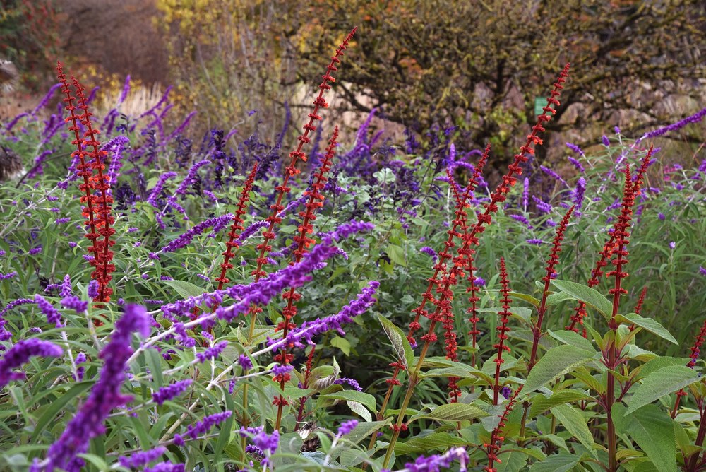 Salvia confertiflora, Salvia ‘Amistad’ y Salvia leucantha ‘Purple Velvet’ en Hermannshof, noviembre 2019 | Joachim Hegmann