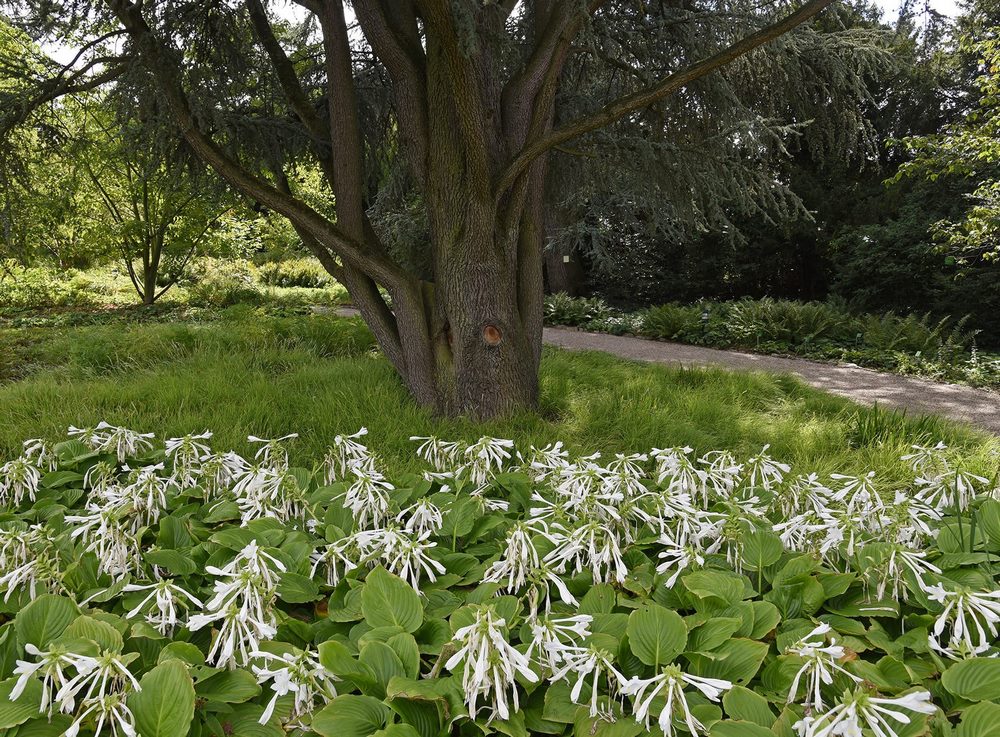 Hostas en flor y Sesleria sp en Hermannshof, septiembre 2019 | Joachim Hegmann