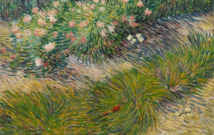 En muchas de esas escenas de la vida rural, Van Gogh encontró la primavera, su luz, sus cielos, su paisaje. Esa primavera que podríamos recorrer con algunas de la pinturas que realizó entre los años 1886 y 1890. Con diferentes estados de ánimo y, cómo no, con muy diversos registros, veremos rosas –cultivadas o silvestres-, iris, ranúnculos o amapolas; frutales en flor, cebollinos, praderas y mariposas; porque son múltiples las formas de pasear a través de los años y sus primaveras.