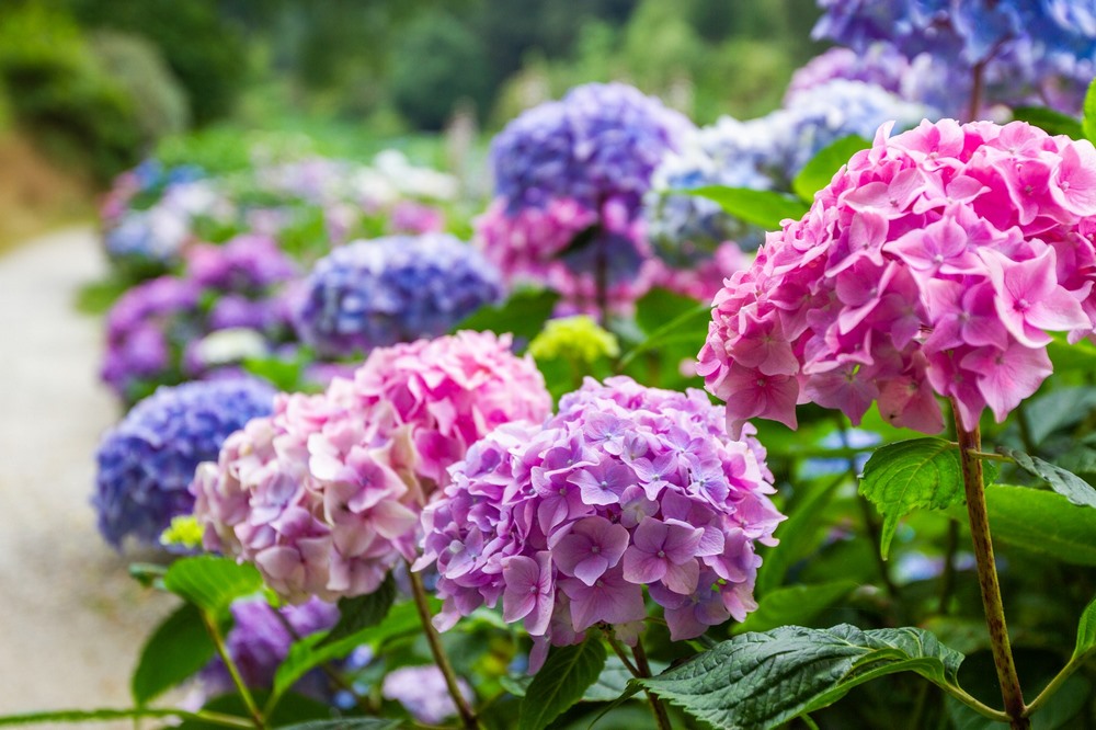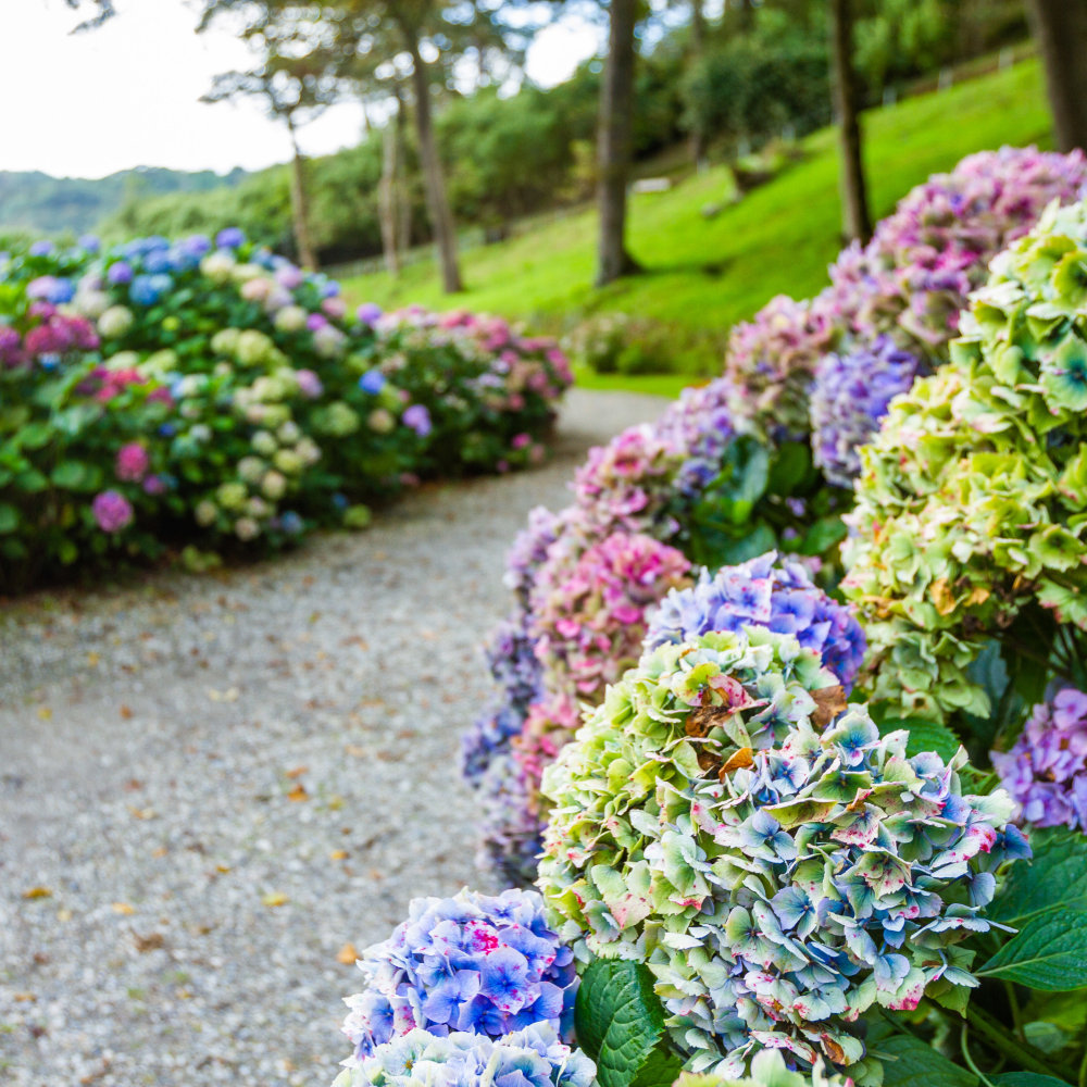 Entre las hortensias típicas (Hydrangea macrophylla tipo mophead), se encuentran también las de flores más planas (lacecap), así como otras especies de hortensias como Hydrangea paniculata, de flores anchas en forma de cono y, entre ellas, no podía faltar el conocido cultivar ‘Limelight’, con flores de color verde lima pálido; y ‘Vanille-Fraise’, con flores blancas en verano que se vuelven rosas y rojo oscuro en otoño.