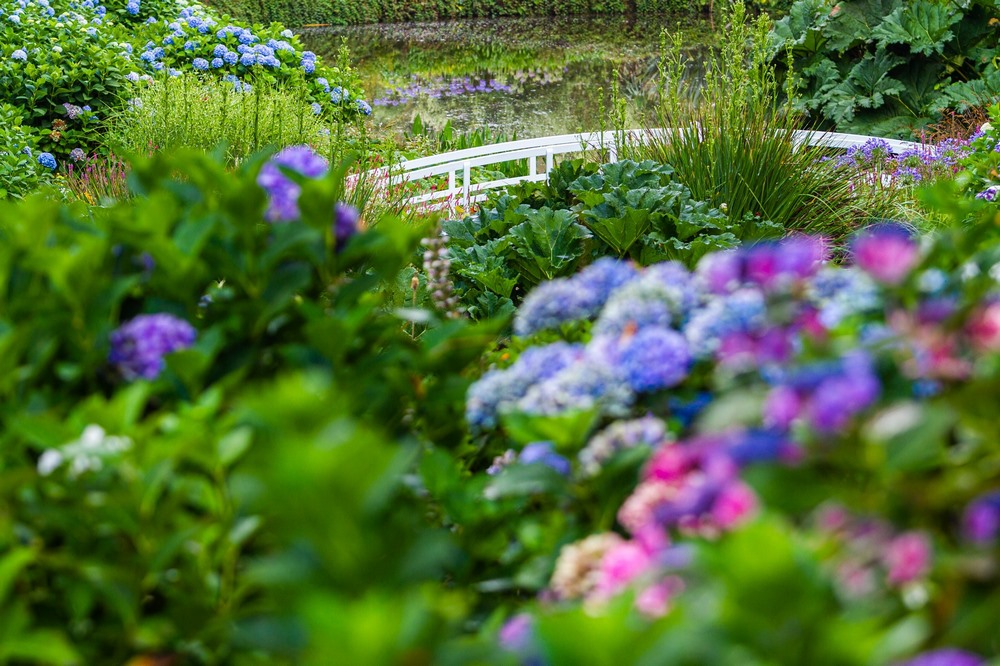 Estos días de julio, las icónicas hortensias (Hydrangea spp.) de Trebah Garden han comenzado a florecer, llenando de belleza ese jardín, especialmente los caminos que rodean el estanque (Mallard Pond), en cuyas aguas se reflejan sus flores, una exhibición que continuará aportando interés en otoño.