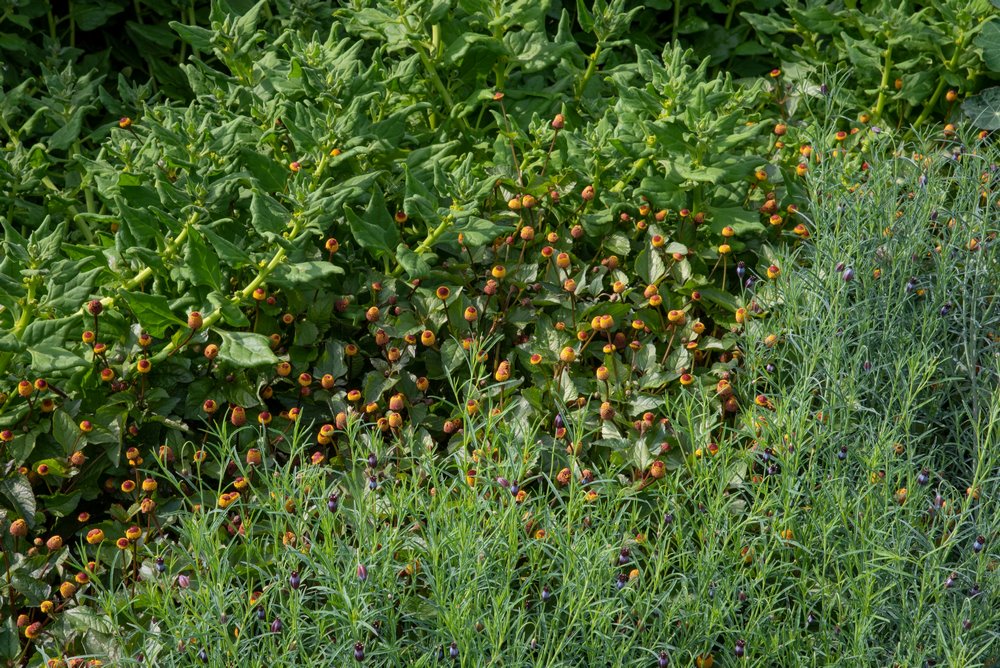 Otros cultivos interesantes que se están probando en ese huerto son Cyperus esculentus, planta herbácea que produce el popular tubérculo comestible conocido como chufa; Decaisnea fargesii, comúnmente conocido como el arbusto de frijol azul debido a sus curiosas vainas de semillas; Solanum x burbankii, arbusto que produce pequeñas bayas negras que resultan excelentes para usar en tartas, budines y mermeladas; Melothria scabra, una cucurbitácea trepadora nativa de Norteamérica que produce esas pequeñísimas sandías conocidas como cucamelon o sandía ratón, entre otros nombres comunes; y los frutos comestibles de Solanum sisymbriifolium revientacaballos o espina colorada, una herbácea de la familia Solanaceae, endémica en Sudamérica y presente en Europa. No faltan otras hierbas culinarias como Porophyllum linaria (pipicha, pepicha, chepiche) y Acmella oleracea (flor eléctrica).