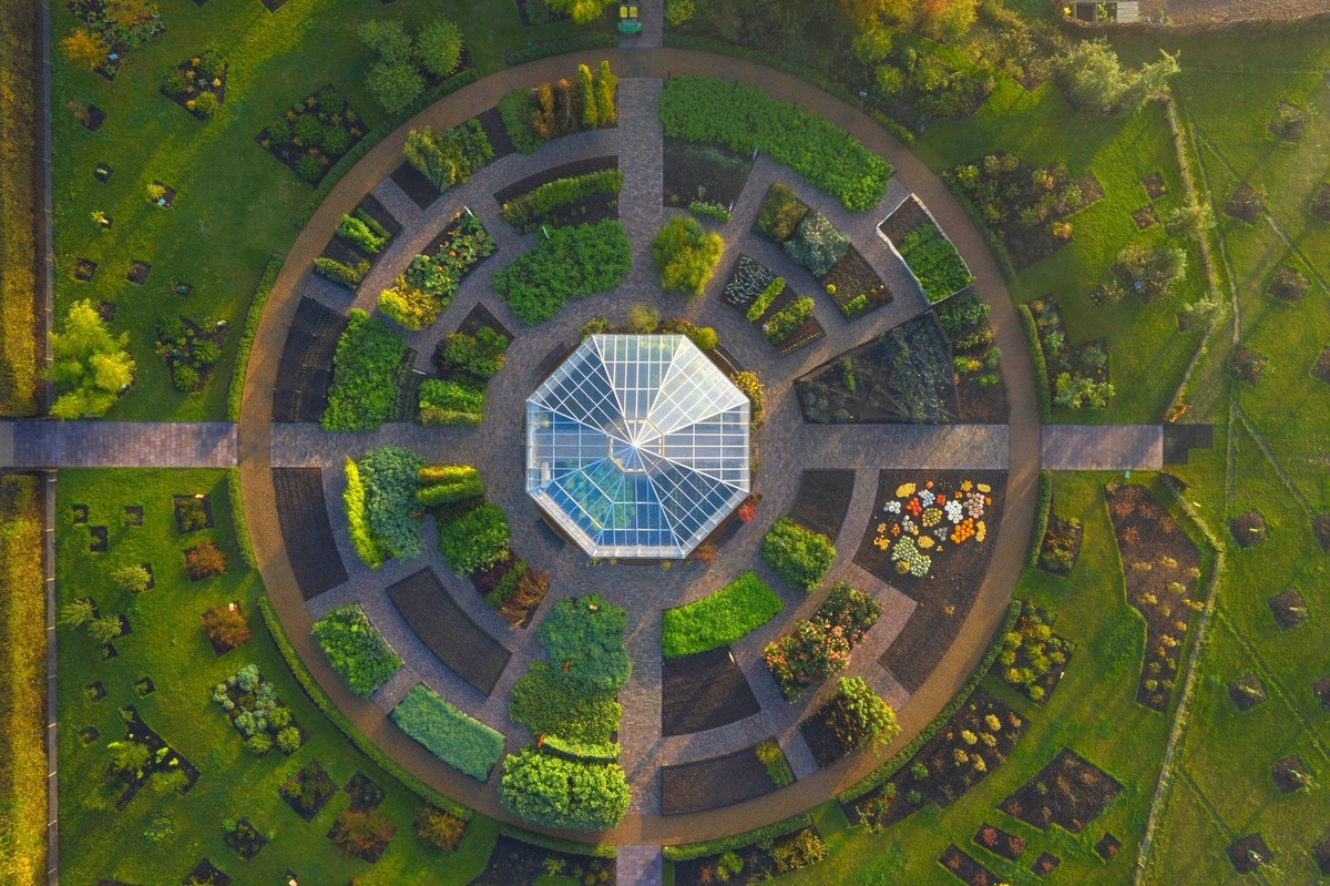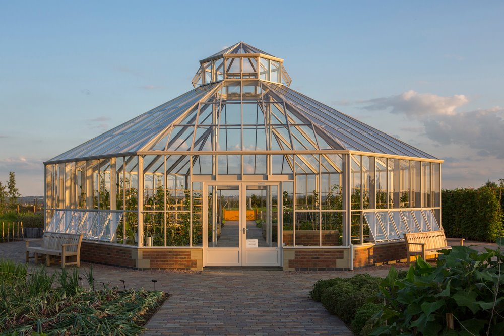 No pasa desapercibido en el centro del jardín el invernadero octagonal de 14 metros de ancho en el que se cultivan plantas comestibles menos resistentes. A su alrededor, los bancos de madera permiten a los visitantes disfrutar de diferentes vistas del jardín.