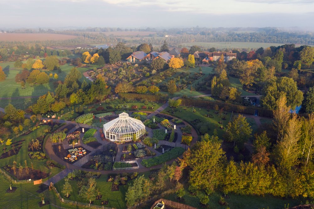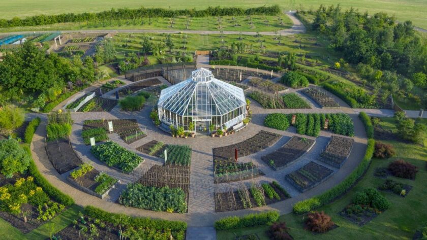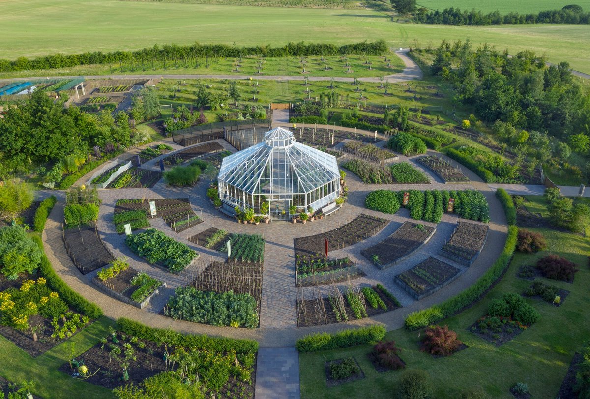 Vista aérea del Global Growth Vegetable Garden en RHS Garden Hyde Hall Foto © RHS