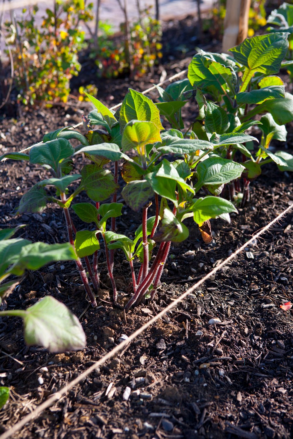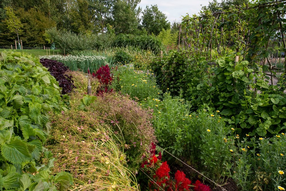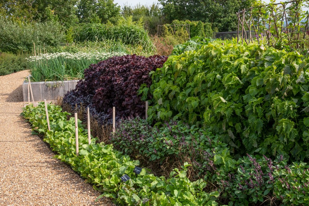 Se utilizó una mezcla de alrededor de 600 toneladas de tierra para todas las camas, donde ahora se están cultivando no solo verduras y hortalizas poco comunes, al menos en Reino Unido, sino también plantas comestibles sorprendentes, como las puntas de las hojas de hosta, los tubérculos de cannas y dalias, y flores de Hemerocallis.