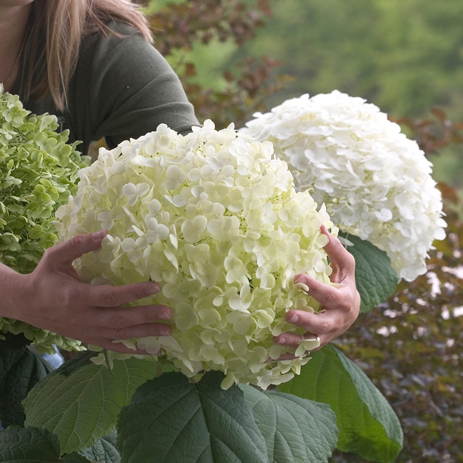 Una selección creada para mejorar a H. arborescens ‘Annabelle’. Una planta con tallos fuertes, resistentes y de apoyo, y cabezas de flores extragrandes (pueden llegar a ser como pelotas de baloncesto) en color blanco cremoso que envejecen hasta un verde jade durante el verano y el otoño. Florece en verano. Altura 120-150 cm de alto y 120-150 cm de ancho. Resistente a -40ºC.