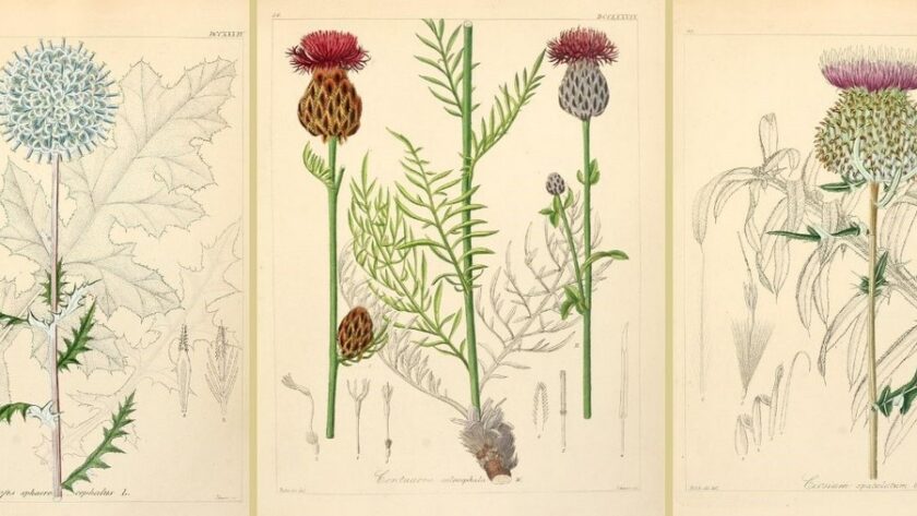 De todas las especies recogidas en ese libro, no he podido resistirme bucear entre algunas de las Cynareae (sin. Cardueae), una tribu de plantas de flores de la familia de las margaritas (Asteraceae) y en la subfamilia Carduoideae. Es decir, plantas que en su mayoría se conocen comúnmente como cardos. y que se recogen en el volumen 15 (1852-53).