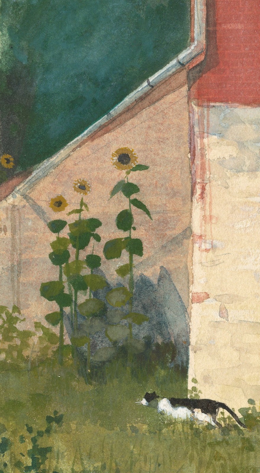 En este caso la escena que describe es un jardín delantero que florece con los toques femeninos propios de aquella época, pero con pequeños indicios de cierto desorden. Girasoles plantados en el suelo y algún que otro geranio en las macetas de las ventanas, mientras que una de las macetas aparece tumbada peligrosamente y un palo apuntala la ventana. El gato parece escapar, aburrido, de esa situación en la que todo hace pensar que el joven granjero está cortejando a la joven de la ventana.