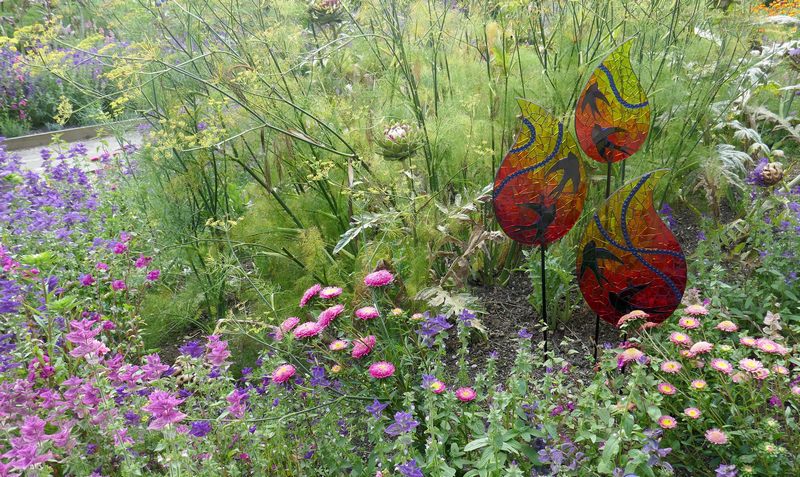 Pero también podemos concentrar la atracción visual hacia una escultura en un jardín contrastando materiales y colores. Plantas de desierto junto a piezas con agua, por ejemplo. Vivos colores contrastando con el verde. Líneas verticales que sobresalen de plantación baja.