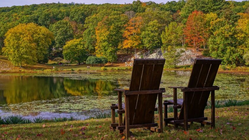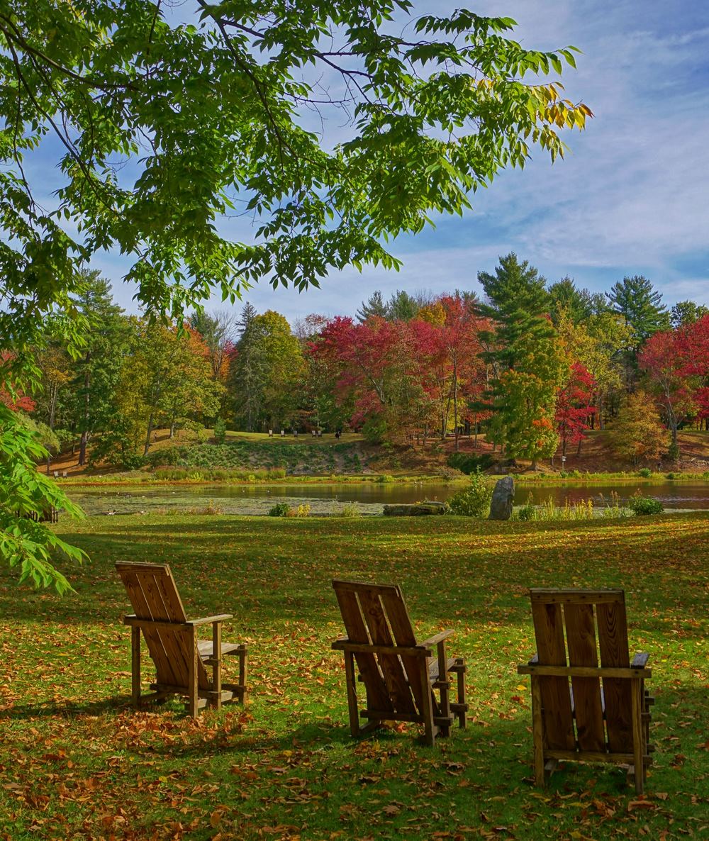 Algunas de las imágenes muestran el diseño elegante de la silla de Rietveld que se adaptó ligeramente para su uso en Innisfree en la década de 1960 y que hoy en día también se pueden ver por docenas alrededor del cercano Wave Hill Garden. Ver: Silla de jardín Wave Hill, una adaptación de la «Silla Roja y Azul» de Rietveld.