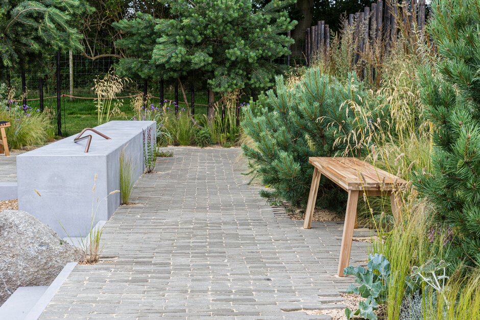 A primera vista, el jardín es un espacio agradable, lleno de gramíneas y herbáceas aromáticas que evocan el Mediterráneo. Pero más allá de su frágil belleza, se descubre la amenaza de los efectos de la Xylella en el un ejemplar de olivo (Olea europaea), que se convierte en el punto focal de ese jardín. Aludiendo también a los efectos de la Xylella, el jardín incluye un seto de lavanda (Lavandula) y laurel de Portugal (Prunus lusitanicus), especies que también se han visto afectadas por la enfermedad.