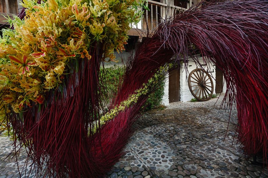 Por último, me ha resultado muy vistosa y con un interesante contraste entre las líneas curvas de la instalación y las rectas del patio, la instalación floral “El impulso de la Pasión” que el diseñador japonés Hideyuki Niwa construyó en el Patio central de la Posada del Potro. La instalación incluía 9.000 plantas de cornejo (cornus alba sibirica) combinadas con 400 flores de Hemerocallys de color amarillo y rojo.