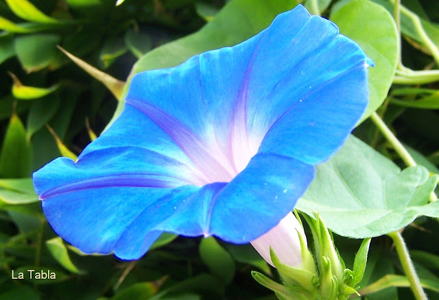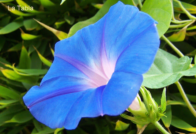 Es una convolvulácea que enreda e invade todo lo que pilla por el camino, por lo que no hay que perderla de vista si está junto a otras plantas. Ésta que os muestro es de los vecinos y  pasa al otro lado enlazándose entre el bambú. Es como la guerra de los invasores en el jardín.