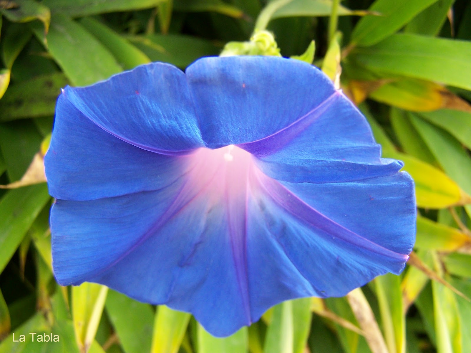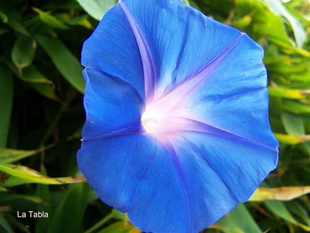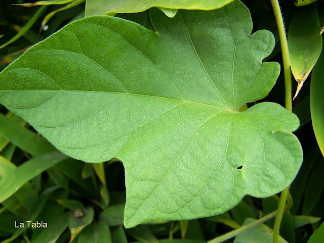 Es una convolvulácea que enreda e invade todo lo que pilla por el camino, por lo que no hay que perderla de vista si está junto a otras plantas. Ésta que os muestro es de los vecinos y  pasa al otro lado enlazándose entre el bambú. Es como la guerra de los invasores en el jardín.