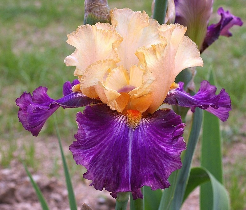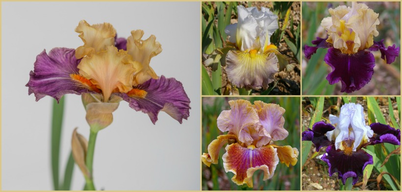 Flores de gran tamaño de pétalos albaricoque claro y sépalos casi horizontales entre morado púrpura y berenjena, con una raya mediana lavanda rosada claro (2,5mm de ancho). Barbas mandarina. De 8 a 10 capullos en promedio.