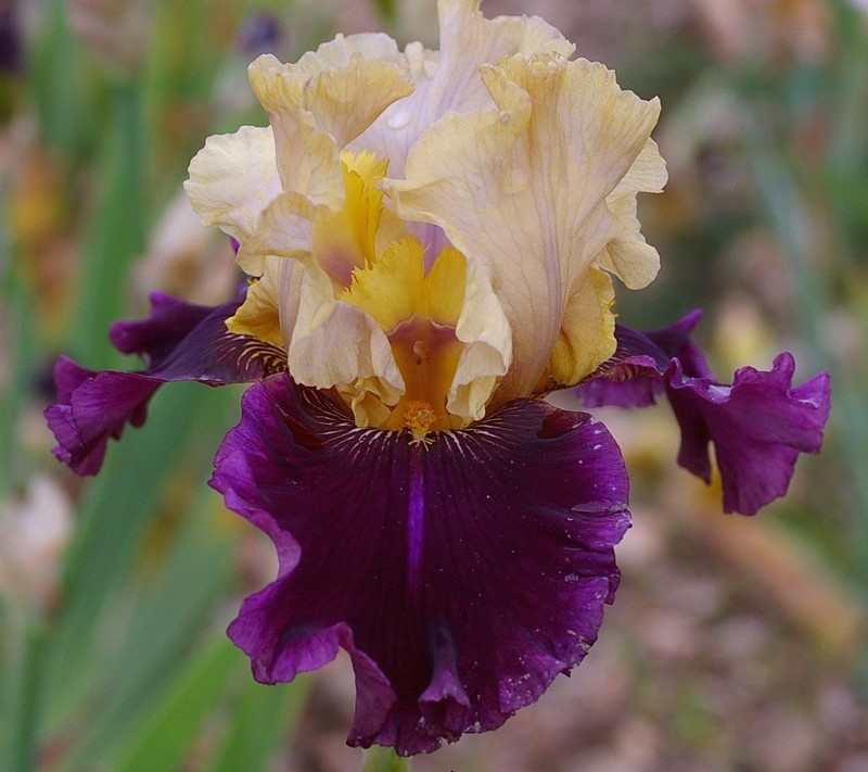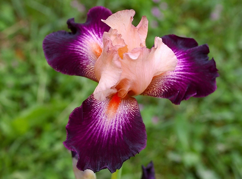Pétalos ámbar cobrizo claro y sépalos horizontales, de aspecto aterciopelado, entre berenjena y violeta púrpura intenso. Piezas florales bien firmes, fuertemente onduladas. Barbas naranja quemada.
