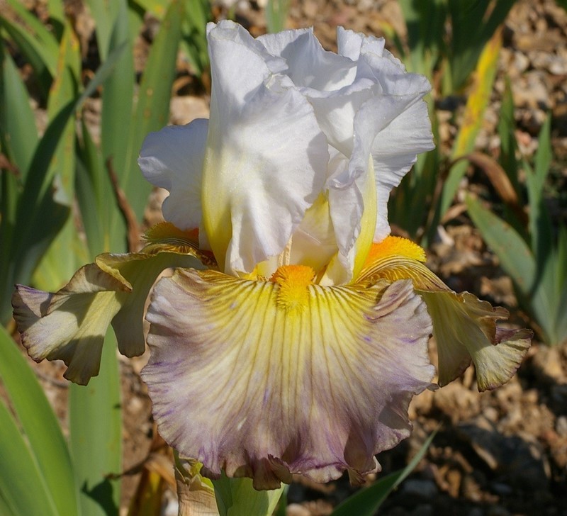 Hijo de ‘Ciel Gris sur Poilly’ de pétalos blancos ligeramente bañados con amarillo hacia el corazón. Anchos sépalos amarillo ahumado claro, volviendose color gamuza en los contornos. Barbas amarillo de maíz. Un colorido fuera de lo común.