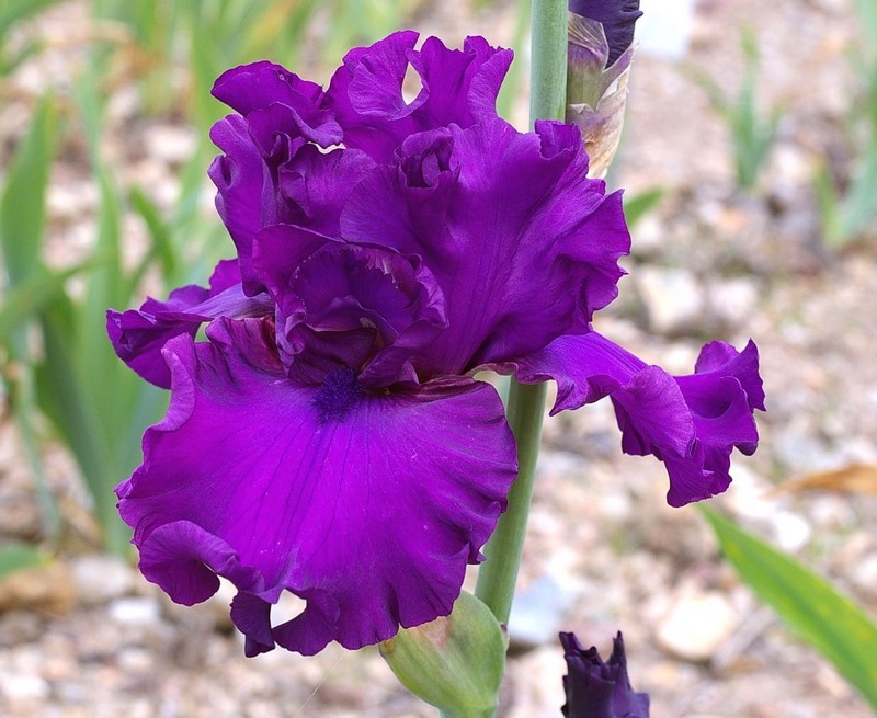 Cruce de ‘Winterfest’ con ‘Purple Serenade’. Flores gigantescas (17cm de diámetro) con un colorido muy liso púrpura intenso. Barbas azul violeta oscuro. Ondulaciones de gran amplitud sobre todo el contorno de la flor, de sus pétalos y sépalos.