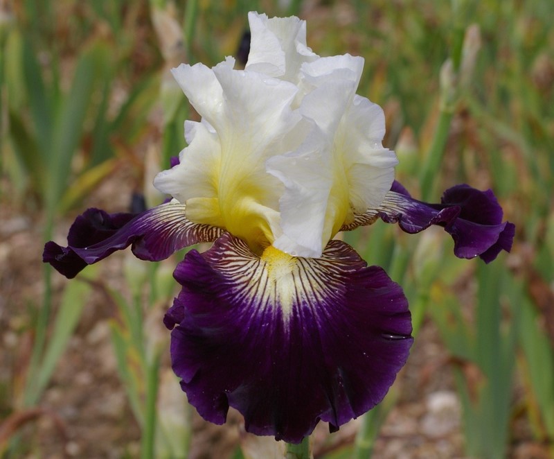 Pétalos blanco cremoso tintados de amarillo tilo en la base de la flor. Sépalos negro violeta con pequeño centro crema y barbas blancas de puntas amarillas.