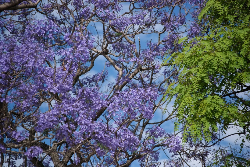 El jacarandá es un árbol frondoso que puede llegar a los 20 metros de altura en edad adulta. Sus ramas son onduladas, abiertas, ascendentes.  Su denominación científica es Jacaranda mimosifoliay pertenece a la familia Bignonaceae. Su nombre vulgar es jacarandátarco. En guaraní, jacarandá significa madera dura y el término mimosifolia se refiere al parecido de sus hojas con los helechos.  Ojo, se dice jacarandá, con acento en la a. Bueno, se puede decir como se desee, pero los argentinos te regañarán, y mucho, si no le pones el acento en la última letra. Para ponérnoslo aún más complicado, unos dirán que en plural se dice jacarandás y otros que es más correcto decir jacarandaes.
