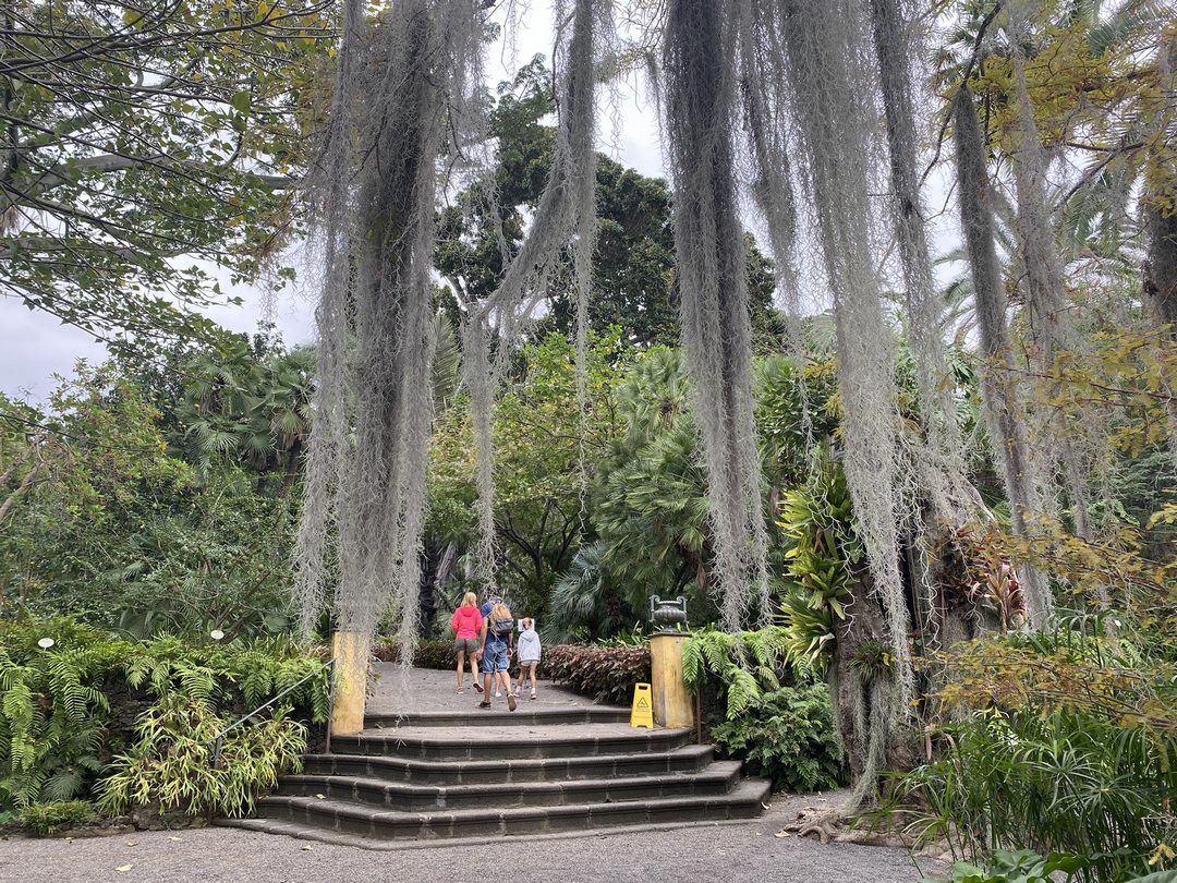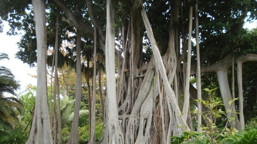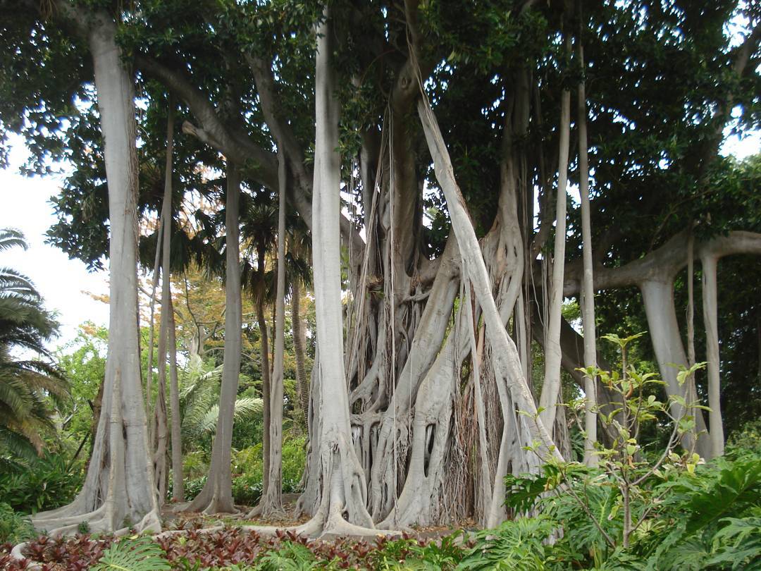 Pero si hubiera que destacar alguna de las especies, tendríamos que referirnos a uno de los iconos del Jardín de Aclimatación de la Orotava, el Ficus macrhophylla f. columnaris (imagen de portada) plantado en los años 70 del siglo XIX, siendo Hermann Wildpret el jardinero botánico del jardín. Esta forma columnar de Ficus macrophylla es originaria de Lord Howe, una pequeña isla situada a 600 km al Este de Australia. Sus raíces aéreas descienden desde las ramas a modo de columnas, y al llegar al suelo se ensanchan y ayudan a soportar el gran peso de las mismas.
