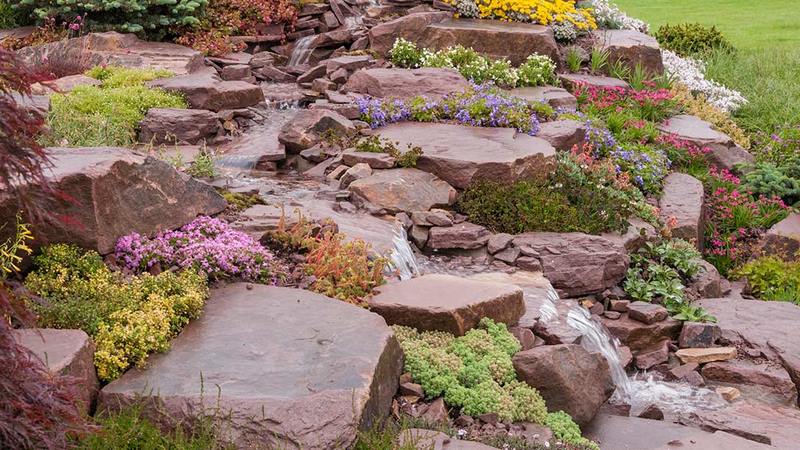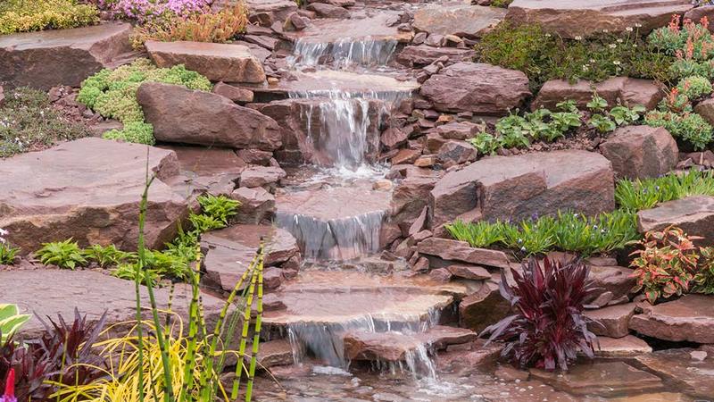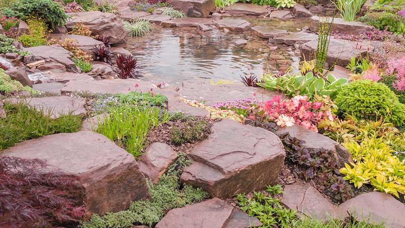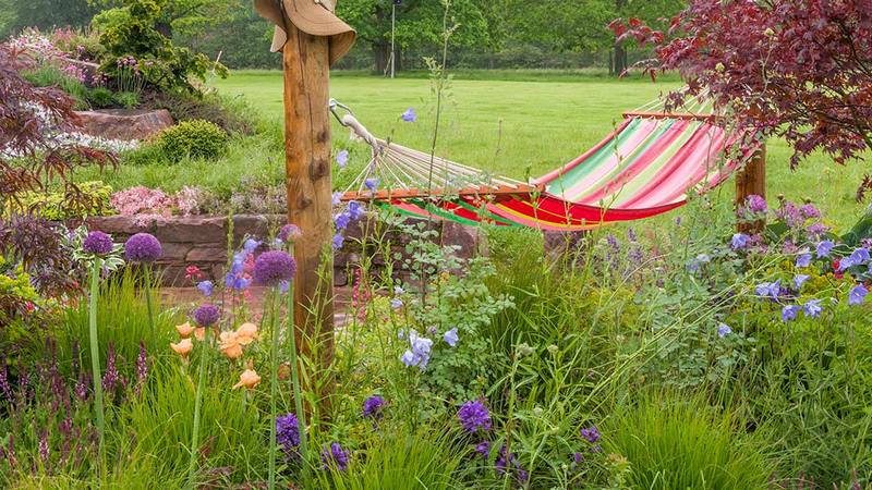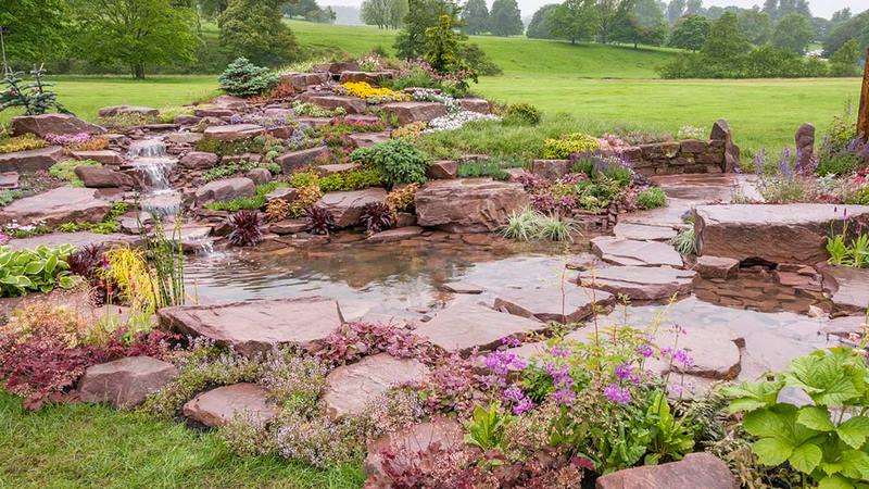 La hamaca oscilante es un guiño a la esencia de su propuesta y está pensada para permitir disfrutar de lo que este jardín de agua de estilo naturalista puede ofrecer, principalmente el sonido del agua que corre entre rocas y cae suavemente en una piscina central. Para este jardín se ha empleado piedra arenisca rosada procedente de una formación rocosa que cubre desde Macclesfield a Derbyshire. Después, y como sugiere el título del jardín, sólo ha añadido agua, bueno, y plantas a su lado, claro.