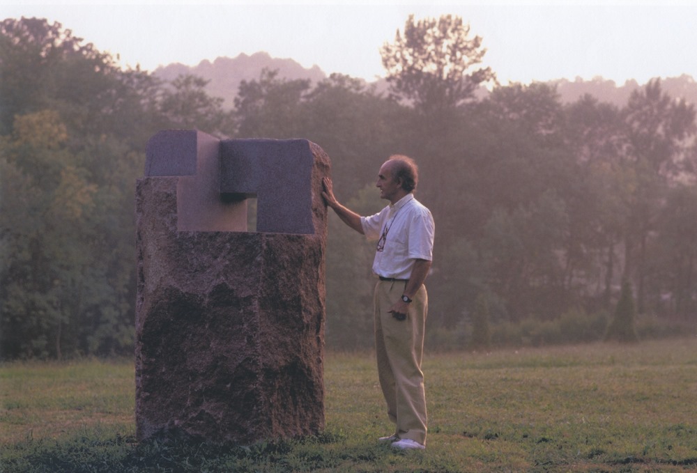 | Eduardo Chillida junto a ‘Lo profundo es el aire, Estela IX’ | © Zabalaga Leku. Foto: Jordi Belver |