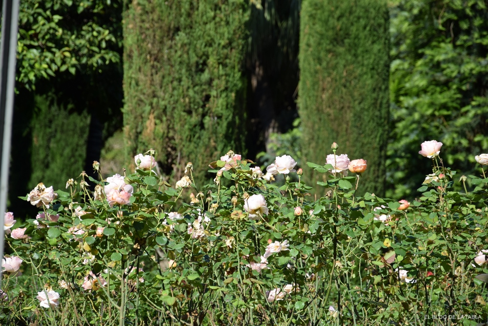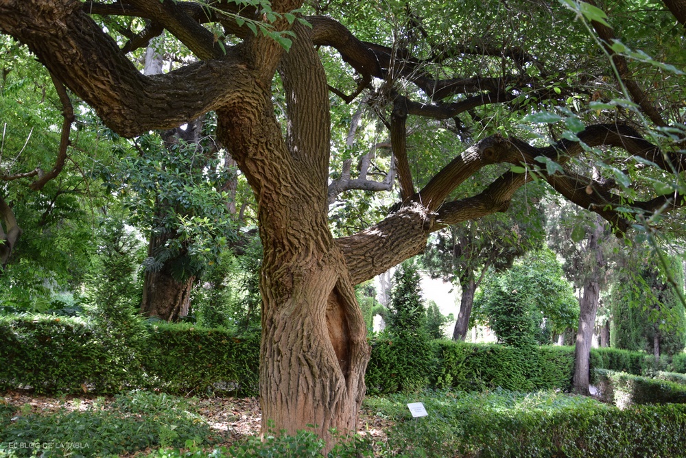 El espacio gira en torno a un laurel monumental y a la Acequia Vista que recorre el jardín, que al llegar al centro de la Rosaleda bordea el Laurel con su trazado.